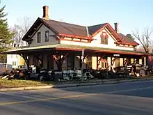North Littleton station was located on the 1858-opened Stony Brook Railroad at Great Road (Route 119).[26] The station building was closed in 1914 and torn down in 1928.[27] It was served by all three daily round trips in 1917, but only a single westbound trip stopped by 1929, and it was no longer served by the 1940s.[28][29][30] While open, it had been a flag stop for local trains as well as the overnight State of Maine Express.[3]:249