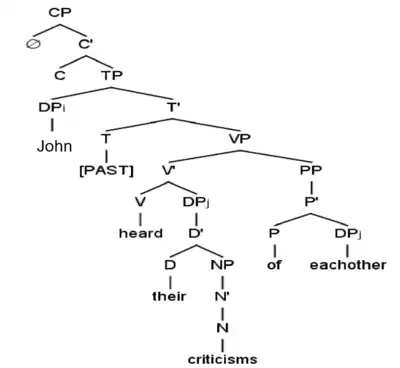 b. *[DP They]i heard John's criticisms of [DP each other]i.[1]: 167 |