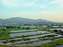 Most of the area in Lok Ma Chau is wetland. The Kai Kung Leng mountain range of Hong Kong is visible in the background.