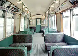 The 51-foot (16 m) long O Stock cars were fitted with air operated doors under the control of the guard. A car had 40 seats and two tip up and access was by two double doors and a single door on each side. Externally, the cars had side panels that flared at the bottom with no running boards to prevent passengers jumping on a moving train and attempting to open a door.[9] The trailers, with four extra seats,[3] had a hinged door at one end, locked closed in normal use, so they could be converted into driving motor cars.[5] Lighting was provided by incandescent bulbs in the ceiling.[3]