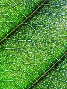 A loquat leaf, shown at a high magnification, illustrating the general appearance of the leaf and the structure of the venation