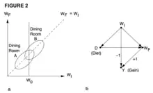 The two ellipses represent two dining halls, each serving a different diet, and each point represents a student's initial and final weights. Note that students who weigh more in the beginning tend to eat in dining hall B, while the ones who weigh less eat in dining hall A. The first statistician claims that switching from Diet A to B would have no effect on weight gain, since the gain WF – WI has the same distribution in both ellipses. The second statistician compares the final weights under Diet A to those of Diet B for a group of students with same initial weight W0 and finds that latter is larger than the former in every level of W0. He concludes therefore that the students on Diet B gain more than those on Diet A. As before, the data can’t tell us whom to believe, and a causal model must be assumed to settle the issue. One plausible model is shown in Figure 2(b). In this model, WI is the only confounder of D and WF, so controlling for WI is essential for deconfounding the causal effect needed. Assuming this model, the second statistician would be correct and the first statistician would be wrong.