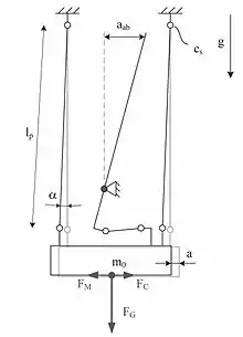 Fig. 6 : Measurement principle, state-of-art weighting balance system : -measurement force, -gravity, -force due to spring constant, -spring constant, -length of beams, a -deflection of pan carrier, -deflection of lever, -deflection angle, -dead load, -gravitational acceleration. Adapted from [17]