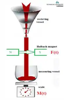 The force measurement system is an important part of the Lorentz force velocimetry. With high resolution force measurement system makes the measurement of even lower conductivity possible. Up to date has the force measurement system continually being developed. At first the pendulum-like setups was used (Figure 5). One of the experimental facilities consists of two high power (410 mT) magnets made of NdFeB suspended by thin wires on both side of channel thereby creating magnetic field perpendicular to the fluid flow, here deflection is measured by interferometer system,.[16][17] The second setup consists of state-of-art weighting balance system (Figure 6) from which is being hanged optimized magnets on the base of Halbach array system. While the total mass of both magnet systems are equal (1 kg), this system induces 3 times higher system response due to arrangement of individual elements in the array and its interaction with predefined fluid profile. Here use of very sensitive force measuring devices is desirable, since flow velocity is being converted from the very tiny detected Lorentz Force. This force in combination with unavoidable dead weight of the magnet () is around . After that, the method of differential force measurement was developed. With this method two balance were used, one with magnet and the other is with same-weight-dummy. In this way the influence of environment would be reduced. Recently, it have been reported that the flow measurements by this method is possible for saltwater flows whose electrical conductivity is as small as 0.06 S/m (range of electrical conductivity of the regular water from tap).[18]