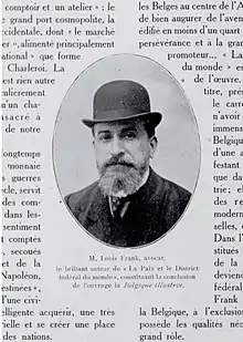 In 1905, Frank wrote The Belgians and Peace. In his book he defends a pacifist and internationalist Belgium. He then published a second volume The Organization of Peace and the Federal District of the World in which he developed the idea for the first time, according to which the city of Brussels would become an ideal administrative capital of a future World Confederation.[2]