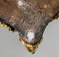 After 1751 each work was signed by the master craftsman who oversaw the work. This mark, called the Estampille, used a heated iron to mark the piece with the initials of the master. It was usually placed on the back of the rear traverse of chairs, under the marble of commodes and secretaries, and under the surrounding ceinture of tables. marks are often missing, either forgotten by the craftsman, or defaced. Given the high value of signed pieces by famous craftsmen, Counterfeit Estampilles are not unknown.[9]
