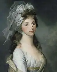 On 16 November 1797, her husband succeeded to the throne of Prussia as King Frederick William III after the death of his father. Louise wrote to her grandmother, "I am now queen, and what rejoices me most is the hope that now I need no longer count my benefactions so carefully."[26] The couple had to abandon their solitude at Paretz and begin living under the restraints of a royal court.[8] They began a tour of the country's eastern provinces for two purposes: the king wanted to acquaint himself with their new subjects, and despite the unusualness of a consort accompanying the king further than the capital, Frederick William wanted to introduce the queen as well to their people.[27] Louise was received everywhere with festivities. For the first time in Prussian history, the queen emerged as a celebrated public personality in her own right, as she occupied a much more prominent role than her predecessors.[5] Louise's presence on her husband's eastern journey was a break from the traditional role of the consort – importantly however the queen's power and enduring legacy did not stem from holding a separate court and policy than her husband's, but rather the opposite: she subordinated her formidable intelligence and skill for her husband's sole advantage.[28] She also became a fashion icon, for instance starting a trend by wearing a neckerchief to keep from getting ill.[29]