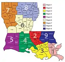 The Louisiana Department of Health provides public health services and oversight across Louisiana in nine regions.[7]