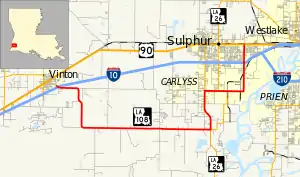 Louisiana Highway 108 (LA 108) is a state highway located in western Calcasieu Parish, Louisiana that runs 24.8 miles (39.9 km) in a general westeast direction from Interstate 10 (I-10) in Vinton to U.S. Highway 90 (US 90) in Sulphur.[1] The highway runs in roughly a "U" shape along section line roads, dipping southward from Vinton then east parallel to I-10 and back to the north toward Sulphur. The majority of the route is signed westeast except for the eastern leg running north to Sulphur, which is signed northsouth. The latter section is also the most travelled, providing access to the oil and petrochemical industry south of Sulphur and a connection to LA 27.