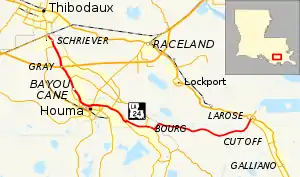 The route has two distinct sections, the longer of which travels through Terrebonne Parish on either side of Bayou Terrebonne. It serves as the main highway through the city of Houma, which is also the parish seat. This portion of the highway is bannered east–west, though it runs primarily north–south. Southeast of Houma, LA 24 does assume an east–west trajectory as it turns away from Bayou Terrebonne and proceeds to the Lafourche Parish community of Larose, located at the junction of Bayou Lafourche and the Gulf Intracoastal Waterway.