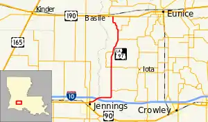Louisiana Highway 97 (LA 97) is a state highway located in southwestern Louisiana. It runs 21.55 miles (34.68 km) in a north–south direction from the junction of U.S. Highway 90 (US 90) and LA 102 in Jennings to U.S. Highway 190 (US 190) east of Basile.