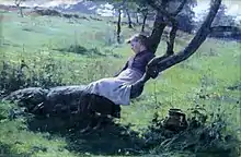 A milestone of Conant's time in France was the summer of 1888, which she spent in the Breton town of Concarneau, with her new friend Cecilia Beaux. Conant and her mother Catherine, and Beaux and her cousin May Whitlock were a foursome in Concarneau. In her autobiography, Background with Figures, Beaux described that summer's activities in detail.[4] Together they took lodging for the summer, which comprised two upstairs rooms in a house, and an attic which served as a kitchen, and afforded a view of the garden below and the sea in the distance.[4]:141 In this pleasant venue, Beaux painted a portrait of Catherine,[4]:147[5] and Conant learned much from Beaux, who was twelve years her senior. Beaux described her as "a delicate, brilliant girl, struggling against ill-health and imperfect eyesight, to become the artist she was born to be ... [who] had superabundant humanity, and almost outdid me in instantaneous and warm interest in passing individuals, as well as in every sight and sound and color."[4]:135–36 Of her language skills, Beaux wrote, "in about a week Lucy had become fluent in all of the Breton language she needed ..."[4]:143