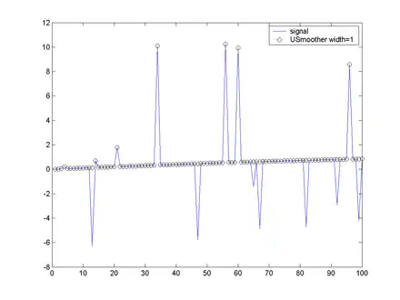 It can be seen that the results of the UL and LU operators can be different. The combined operators are very effective at removing impulsive noise, the only cases where the noise is not removed effectively is where we get multiple noise signals very close together, in which case the filter 'sees' the multiple noises as part of the signal.