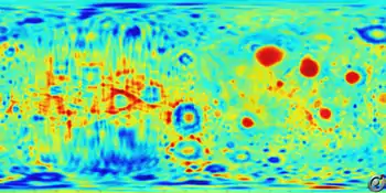 A visualization of the lunar gravity field based on spherical harmonic coefficients determined from Lunar Prospector data. The left side of the image shows the far side of the Moon where the increased uncertainty in the gravity field can be seen.