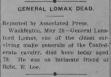 - 1 2 3 4 "Generals of the Confederacy - Lunsford Lindsay Lomax". Alexandria Library. 2012-02-07. Archived from the original on 2012-02-07. Retrieved 2020-04-21.