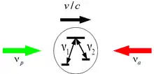 with as frequency of the laser beam propagating anti-parallel to the ion beam and as frequency of the laser beam propagating parallel to the ion beam. and are the transition frequencies of the transitions in rest. with as ion velocity and as speed of light. In the case of saturation spectroscopy the formula changes to