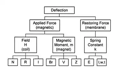 The applied force depends on both the field from the coils and the magnet. The remanence value of the magnet,[4] its volume and position from the coils all contribute to its effect on the applied Force. Whereas the number of turns of coil, its size (radius) and the amount of current passing through it determines its effect on the Applied Force. The spring constant depends on the Young's Modulus of the moving structure, and its length, width and thickness.