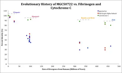 Divergence of the human MGC50722 gene graphed against Fibrinogen and Cytochrome C divergence. Each data point on the graph represents a different species and that species homologous gene as identified through BLAST. BLAST searches were conducted using the human MGC50722, Fibrinogen and Cytochrome C gene and the percent identities were graphed against the actual divergence from humans for that species homologous gene.