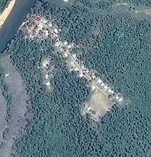 Most houses of the village are along a dead-ending dirt road that approaches the Rokel River approximately at the right angles. Closer to the river the road splits and the lower part of the village is wider (see satellite image of Mabilafu). This lower part of the village is older than the upper part, where most houses just had been constructed recently. The village is divided roughly in four quarters, each for one of the four #landowning families of Mabilafu. The mosque can be found in the lower part of the village, where the people also have constructed a new village center, an open sided, zinc roofed cement building with a seed storage, a small stage and wooden benches. Meetings and other events take place in this village center. An Evangelical Mission Primary School is located by the end of the upper part of the village. In 2013 a total of 265 children from Mabilafu and surrounding villages were enrolled at this school that also distributed a daily meal provided by the World Food Program.[1][2]