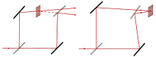 It is interesting to consider what would happen if the photon were definitely in either the "lower" or "upper" paths between the beam splitters. This can be accomplished by blocking one of the paths, or equivalently by removing the first beam splitter (and feeding the photon from the left or the bottom, as desired). In both cases there will no longer be interference between the paths, and the probabilities are given by , independently of the phase . From this we can conclude that the photon does not take one path or another after the first beam splitter, but rather that it must be described by a genuine quantum superposition of the two paths.[7]