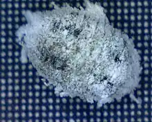 The mature female lays eggs in an egg sack of white wax, usually in clusters on the twigs, branches, and bark of the host plant, and also on the plant's leaves and terminal ends. Eggs are initially orange in color but turn pink on maturity. Egg development takes between 3 and 9 days. Eggs are minute, varying from 0.3 to 0.4 mm in length and number as many as 654 eggs per sack. In its egg stage, the hibiscus mealybug disperses most easily by wind. The wax, which sticks to each egg, also facilitates passive transport by animals or man. Reproduction may occur by means of parthenogenesis in the absence of the male.