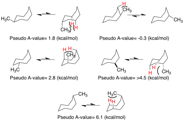 Substitution positional preferences in the ground state conformer of methyl cyclooctane can be approximated using parameters similar to those for smaller rings. In general, the substituents exhibit preferences for equatorial placement, except for the lowest energy structure (pseudo A-value of -0.3 kcal/mol in figure below) in which axial substitution is favored. The "pseudo A-value" is best treated as the approximate energy difference between placing the methyl substituent in the equatorial or axial positions. The most energetically unfavorable interaction involves axial substitution at the vertex of the boat portion of the ring (6.1 kcal/mol).
