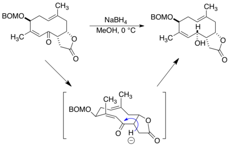 In the synthesis of the cytotoxic germacranolide sesquiterpene eucannabinolide, Still demonstrates the application of the peripheral attack model to the reduction of a ketone to set a new stereocenter using NaBH4. Significantly, the synthesis of eucannabinolide relied on the usage of molecular mechanics (MM2) computational modeling to predict the lowest energy conformation of the macrocycle to design substrate-controlled stereochemical reactions.
