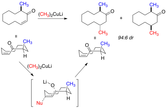 Conjugate addition to the E-enone below also follows the expected peripheral attack model to yield predominantly trans product.[22] High selectivity in this addition can be attributed to the placement of sp2 centers such that transannular nonbonded interactions are minimized, while also placing the methyl substitution in the more energetically favorable position for cyclodecane rings. This ground state conformation heavily biases conjugate addition to the less hindered diastereoface.