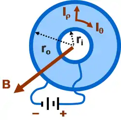 An example of magnetoresistance due to direct action of magnetic field on electric current can be studied on a Corbino disc (see Figure). It consists of a conducting annulus with perfectly conducting rims. Without a magnetic field, the battery drives a radial current between the rims. When a magnetic field perpendicular to the plane of the annulus is applied, (either into or out of the page) a circular component of current flows as well, due to Lorentz force. Initial interest in this problem began with Boltzmann in 1886, and independently was re-examined by Corbino in 1911.[6]