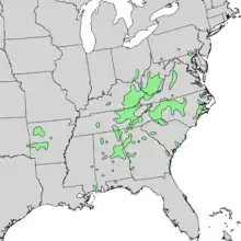 Umbrella magnolias have a native range from New York state to southern Florida. This range also expands as far west as Arkansas and parts of Oklahoma.[14] It is located in deciduous forests of the Appalachian Mountains.[15] Research has shown the species to be non-native to northern states such as Pennsylvania, and only being a recent arrival.[14] This species has been cultivated in locations outsides its natural range, and has spread from these locations to nearby woodlands.[16] Magnolia tripetala has been observed in forests outside its native range in multiple instances. Single individuals and small populations have been observed near areas where M. tripetala is in cultivation.[17] Magnolia tripetala has been given the FACU wetland status, tending to prefer average to dry soil.[9] The trees have low tolerance to drought and fire.