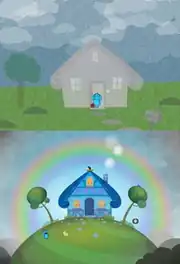 Cyber Chicken Animation Studio and DQ Entertainment Limited animate the series in traditional 2-D. The character designs are kept from the web series, with some changed details; such as cleaner lines and brighter eyes.[15] Despite the fact that both versions use Adobe Flash to create animation, the television episodes have smooth animation and a vivid color palette. This is because the characters and backgrounds in the web episodes were made of overlapping JPEG files, and that the television series had access to an actual budget due to being a show on a television cable network.[16] Noticeably, the colors still go outside the outlines, which is a unique stylistic choice.[17] Every building was changed; in the web cartoon most buildings were grey, but were changed to different colors for the TV version. Each house represents a character.[18][19] Vendetta's house is dark green and Charlotte's blue, matching their own skin color.[18]
