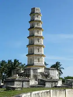 The word Manora is believed to be derived from the word minar meaning tower. The fort is hexagonal structure and has eight storeys, raising to a height of 75 ft (23 m) tapering to its top. The tower is surrounded by a wall and a moat ant it resembles a fort. The monument looks like a pagoda, with arched windows, circular staircase and eaves separating one storey from the other.