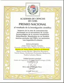 - ↑ Al Mahtab, M.; Akbar, S. M.; Aguilar, J. C.; Guillen, G.; Penton, E.; Tuero, A.; Yoshida, O.; Hiasa, Y.; Onji, M. (2018). "Treatment of chronic hepatitis B naïve patients with a therapeutic vaccine containing HBs and HBc antigens (a randomized, open and treatment controlled phase III clinical trial)". PLOS ONE. 13 (8): e0201236. Bibcode:2018PLoSO..1301236A. doi:10.1371/journal.pone.0201236. PMC 6104936. PMID 30133478.