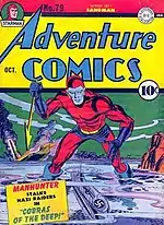 Paul Kirk was originally depicted as a non-costumed independent investigator, who helped police solve crimes during the early 1940s.[1] Though the series was titled "Paul Kirk, Manhunter", Kirk didn't use the Manhunter name as an alias. He appeared in Adventure Comics #58–72 (Jan. 1941 – March 1942).[2][3]