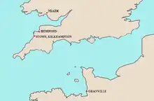 According to the account by the Continuator of Wace and others,[3] in his youth Brictric declined the romantic advances of Matilda and his great fiefdom was thereupon seized by her. Whatever the truth of the matter, years later when she was acting as Regent in England for William the Conqueror, she used her authority to confiscate Brictric's lands and threw him into prison, where he died.[4] The Exon Domesday[5] notes that Bideford and nearby Littleham were held at fee farm from the king by Gotshelm, a Devonshire tenant-in-chief of 28 manors and brother of Walter de Claville.[6] Gotshelm's 28 manors descended to the Honour of Gloucester,[7] as did most of Brictric's.
