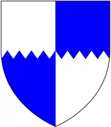 The de Acton family long held the manor of Iron Acton, from which they took their surname. Their arms were: Quarterly per fess indented argent and azure. The arms of Reynold de Acton in the Collins Roll of Arms are blazoned as Quarterly per fess indented azure and ermine.[1] The later descent of this family as recorded in the heraldic visitation of Gloucestershire is as follows:[2]
