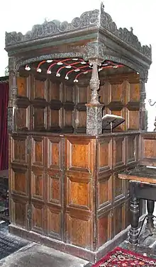 The "Bourchier Pew" (or "Manorial Pew") in the north transept was made in about 1550 in Franco-Flemish early Renaissance style,[18] and decorated with Bourchier knots, it was used by the lords of the manor of Tawstock. The unusual and small manorial pew [lower-alpha 1] has been mistaken for a confessional due to its box-like appearance.