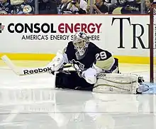 Fleury immediately made his NHL debut in 2003–04 as the youngest goaltender in the league at 18 years old (three years younger than the second-youngest, Rick DiPietro of the New York Islanders).[7] He appeared in his first NHL game on October 10, 2003, against the Los Angeles Kings, recording an impressive 46-save performance, which included a penalty shot save, in a 3–0 loss.[8] Fleury recorded his first NHL win in his very next start, on October 18, with 31 saves in a 4–3 win over the Detroit Red Wings.[9] His first NHL shutout came on October 30, in a 1–0 victory over the Chicago Blackhawks.[9] Fleury shared time with goaltenders Jean-Sébastien Aubin and Sébastien Caron[10] and lived up to first-overall-pick expectations early, earning Rookie of the Month honours in October with a 2–2–2 record, 1.96 goals against average (GAA) and .943 save percentage.[7] As the season progressed, however, his performance began to sink, mainly due to Pittsburgh's poor defence.[9][10] The team regularly gave up over 30 shots per game, and rarely managed to become an offensive threat.[11] He was loaned to Team Canada for the 2004 World Junior Championships in December and, upon returning with a second consecutive silver medal, he was sent back to the QMJHL on January 29, 2004.[10] In light of financial difficulties for the franchise, it is believed Fleury's $3 million contract bonus, which he would have potentially received if he stayed and met several performance goals, was a factor in the decision to return him to Cape Breton.[10] To no avail, Fleury offered to forfeit his bonus to remain with the club.[12] Fleury finished the QMJHL season with Cape Breton in a first round elimination and was subsequently assigned to Pittsburgh's American Hockey League (AHL) affiliate, the Wilkes-Barre/Scranton Penguins, and appeared in two post-season games.