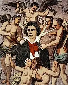 His major works include The 120 Days of Sodom, Justine, Juliette and Philosophy in the Bedroom which combine graphic descriptions of sex acts, rape, torture, murder, and child abuse with discourses on religion, politics, sexuality, and philosophy. The word sadism derives from his fictional characters who take pleasure in inflicting pain on others.[3][4]