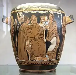 The gamos was the wedding day, where a series of ceremonies surrounded the transfer of the bride from her father's home to that of her new husband. It started with a sacrifice, proteleia, (premarital), which was for the gods to bless the two being wed. The day's rituals began with a nuptial bath which was given to the bride. This bath symbolized purification as well as fertility, and the water would have been delivered from a special location or type of container called the loutrophoros.[2] The bride and groom then made offerings at the temple to ensure a fruitful future life. A wedding feast at the home of the father of the bride[11] would be attended by both families. However, men and women sat at different tables, the women would sit and wait until the men were done.[38] The most significant ritual of the wedding day was the anakalypteria, which was the removal of the bride's veil.[39] This signified the completion of the transfer to her husband's family.
