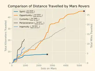 Comparison of the distances travelled by various Mars rovers