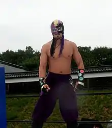 Masamune (政宗, Masamune)[3] (born August 16, 1974) is a masked Japanese professional wrestler. He currently works for Dotonbori Pro Wrestling and has also worked for Kaientai Dojo (K-Dojo) and Osaka Pro Wrestling (OPW) in Japan.[2] For several years he formed a tag team with Japanese wrestler Hideyoshi and was also part of a group known as Bad Force. Greatly influenced by lucha libre, Masamune has followed Mexican tradition for masked wrestlers, so his real name is not a matter of public record.