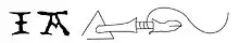 The signature of Master I. A. M. as it appears on The Madonna Seated, the Christ Child Holding the Cross. The object depicted is a medieval gold drill, the insignia of a goldsmith. Initially it was believed to represent a weaver's shuttle.[1]