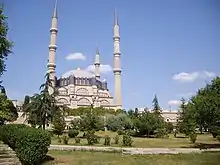The Selimiye Mosque in Edirne, Turkey, was built by Mimar Sinan to provide a space where the mihrab could be seen from anywhere inside the building. The very large central space is accordingly arranged as an octagon, formed by eight enormous pillars, and capped by a circular dome of 31.25 metres (102.5 ft) diameter and 43 metres (141 ft) high. The octagon is formed into a square with four semidomes, and externally by four exceptionally tall minarets, 83 metres (272 ft) tall. The building's plan is thus a circle, inside an octagon, inside a square.[74]
