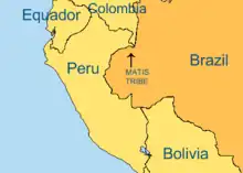 The Matis people (also called Matsë in their own native language) are an indigenous people of Brazil.[1] The Matis are commonly named the Jaguar people by tourists and filmmakers, but they do not like the name. They live in three separate communities with a total population of roughly 340. They live in the far west of Brazil, in the Vale do Javari Indigenous Territory, an area covering 83,000 square kilometres (32,000 sq mi). They practice hunting, fishing, foraging and agriculture. Now, they also receive money from their work as teachers, health assistants, and surveillance of the territory for FUNAI, for example, and the elders receive pensions from the government (registered as retired farmers, as other traditional communities also have the right for in Brazil).