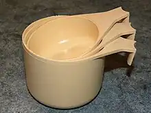 A measuring cup is a kitchen utensil used primarily to measure the volume of liquid or bulk solid cooking ingredients such as flour and sugar, especially for volumes from about 50 mL (approx. 2 fl oz) upwards. Measuring cups are also used to measure washing powder, liquid detergents and bleach for clothes washing. The cup will usually have a scale marked in cups and fractions of a cup, and often with fluid measure and weight of a selection of dry foodstuffs.