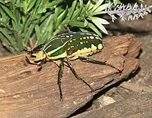 Mecynorhina polyphemus is a large scarab beetle of the subfamily Cetoniinae found in dense tropical African forests, sometimes called the Polyphemus beetle. It is a frequent feeder on fruits and sap flows from tree wounds.