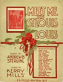 "Meet Me in St. Louis, Louis", better known as just "Meet Me in St. Louis", is a popular song from 1904 on the occurrence of the St. Louis World's Fair which celebrated the Louisiana Purchase Exposition. The words were by Andrew B. Sterling; the music by Kerry Mills. The song was published in 1904 in New York by Mills's firm, F. A. Mills. It was recorded that year by many artists, including William F. Denny,[1] Billy Murray and Arthur Collins.