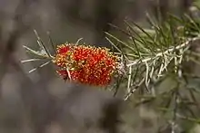 Although it has prickly leaves, the attractive flower spikes of M. brachyandra make it a suitable ornamental for temperate gardens.[3] It is usually more resistant to pests than other species of the former Callistemon.[11] It prefers well-drained soil in a sunny situation.[12]