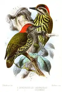 | Illustration (right) with Gabon woodpecker (in front) | |